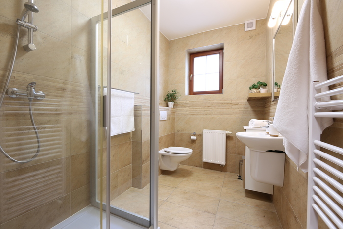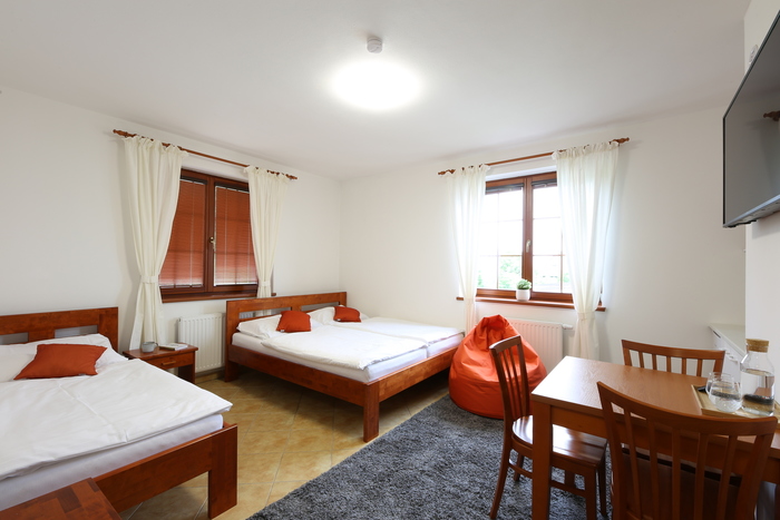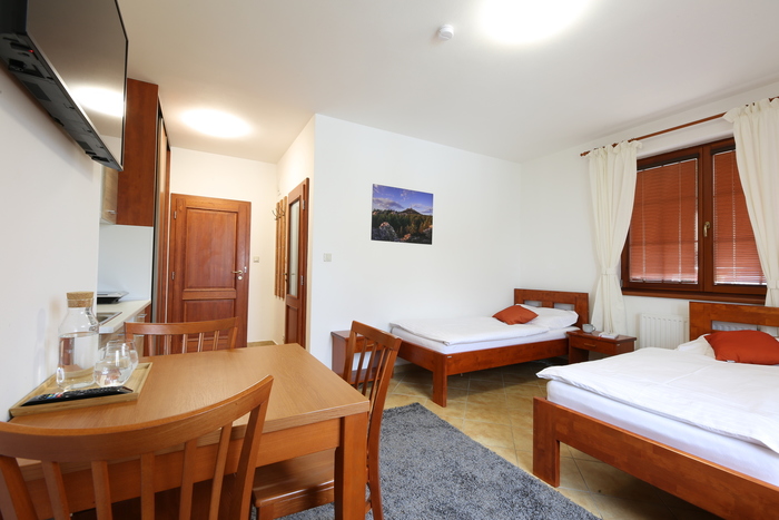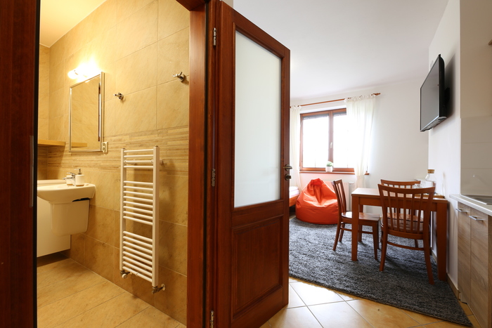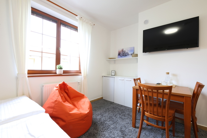 Světlý apartmán ideální pro páry nebo menší rodiny. Nabídne prostornou koupelnu, dostatek místa na uložení sportovního oblečení a výhled do zahrady a lesů. Kuchyňka s jídelním stolem je samozřejmostí. Apartmán je umístěn ve druhém nadzemním podlaží.