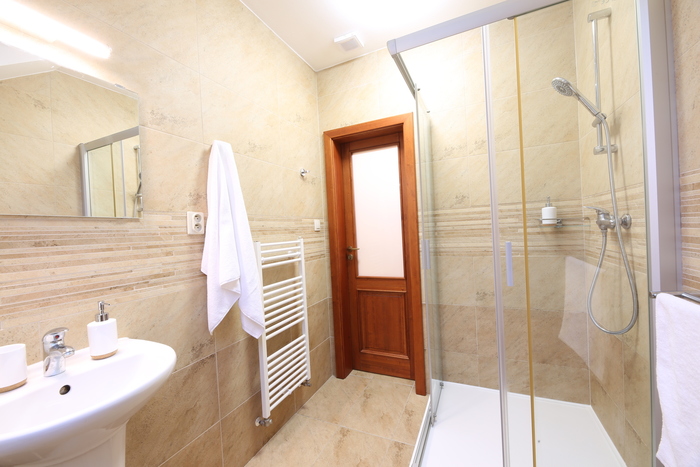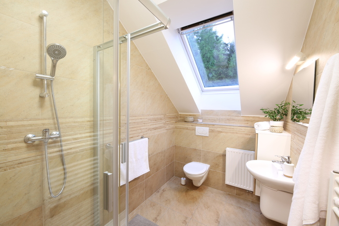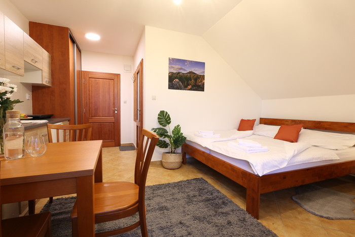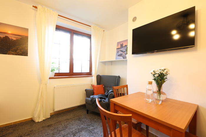Styl a komfort jsou hlavními přednostmi tohoto podkrovního apartmánu. Prostorná koupelna, pohodlný ušák pro relaxační chvíle a velká skříň. Kuchyňka s jídelním stolem. Apartmán je umístěn ve třetím nadzemním podlaží s výhledem na Liberec a krkonošský hřeben.