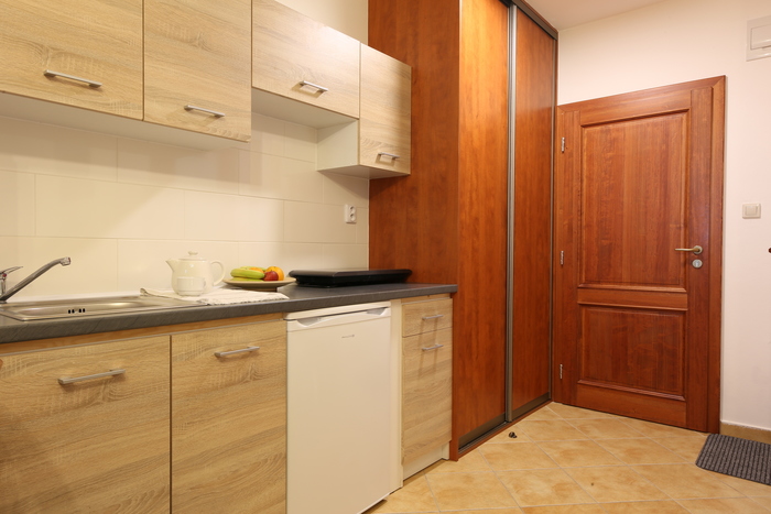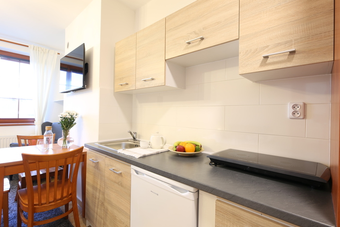 kuchyňka s lednicí a varnou deskou, TV, Wi-Fi, velká šatní skříň, fén