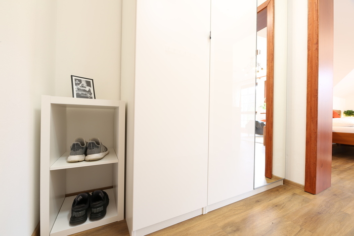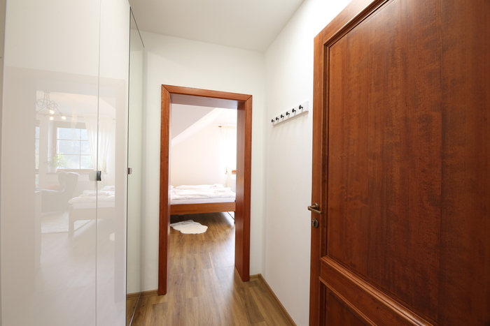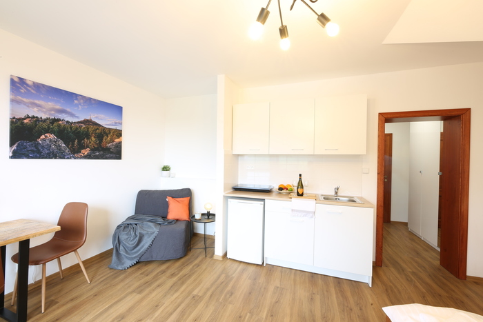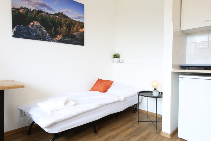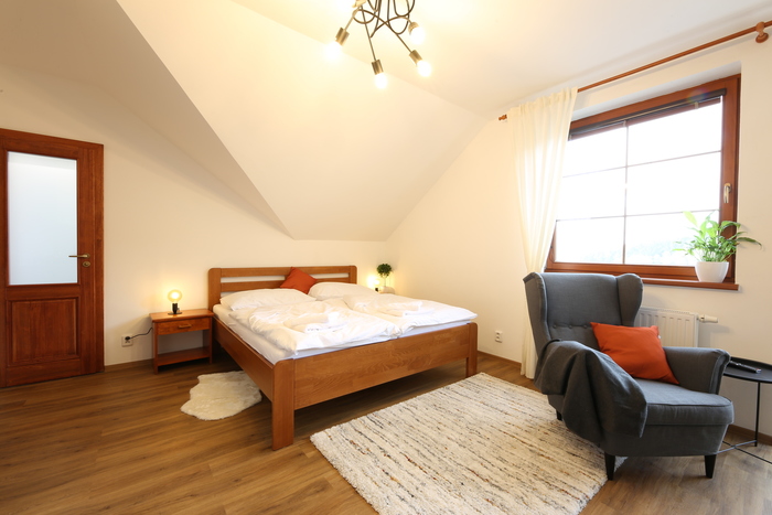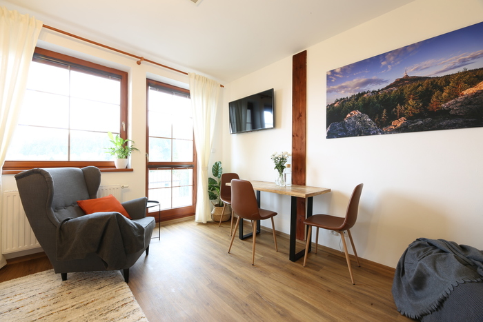 Ideální výběr pro hosty v páru nebo malou rodinu. Masivní manželská postel doplněná ušákem pro odpočinek s knížkou v ruce. Balkón s výhledem na Liberec, Krkonoše a na skokanský můstek pod Ještědem. Kuchyňka, jídelní stůl. Apartmán se nachází ve třetím nadzemním podlaží.